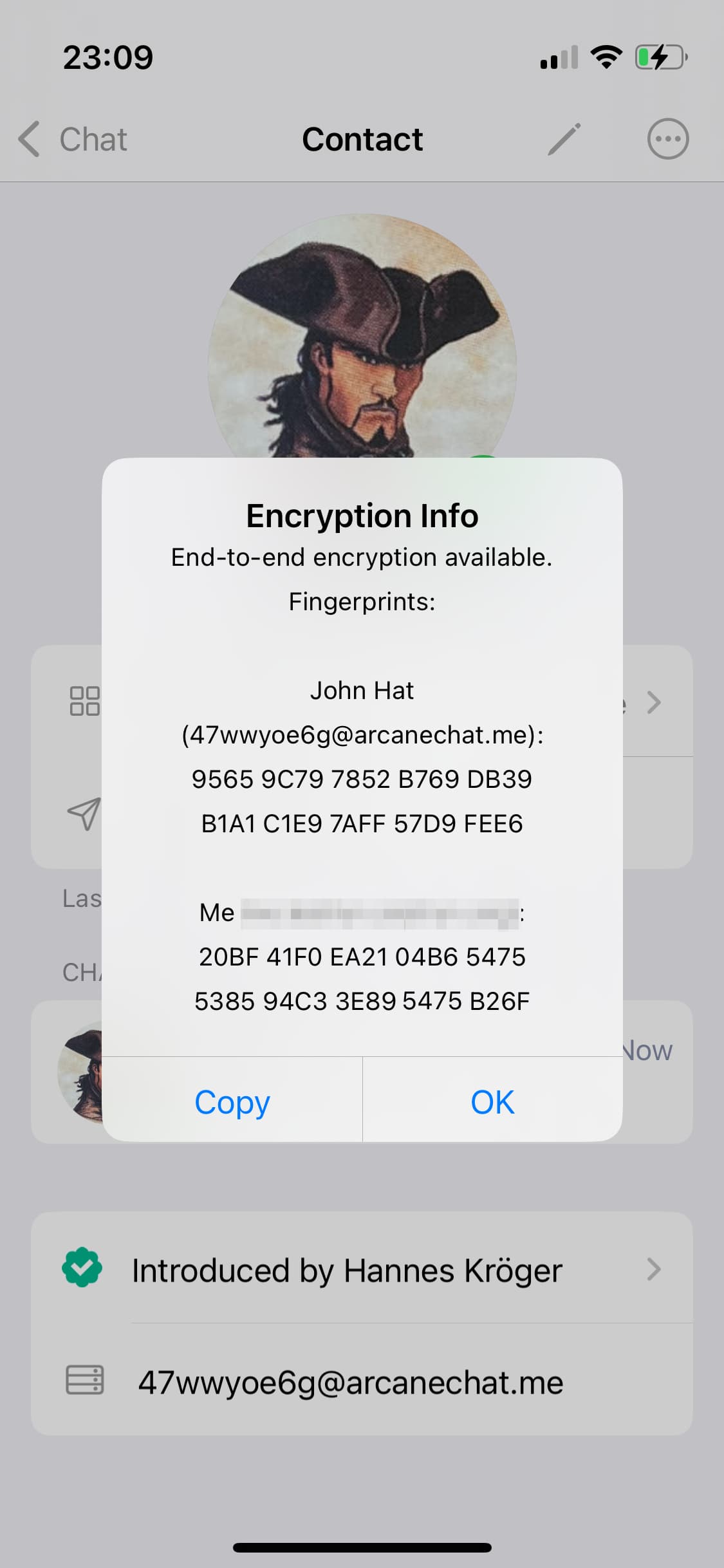 There is no easy way to save fingerprint of user’s public key (in Electron desktop). I can see it in contact’s ‘Encryption info’, but can’t copy it. AFAIK on Android DC app it’s also not possible.