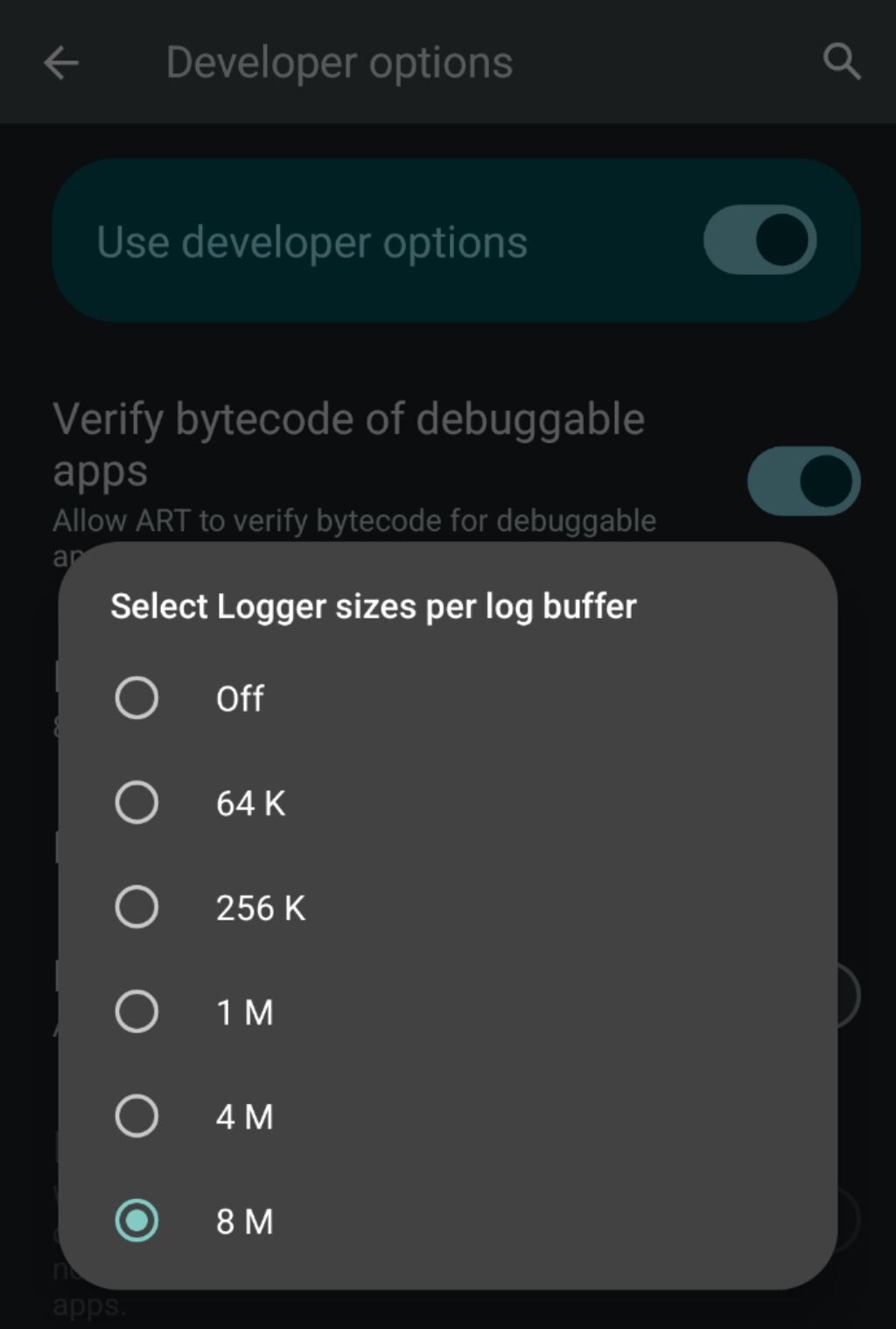 Newer Android versions store only very short logs by default. If you are reporting a bug and want to attach a log, the log will be more useful if you increase log sizes before capturing it.