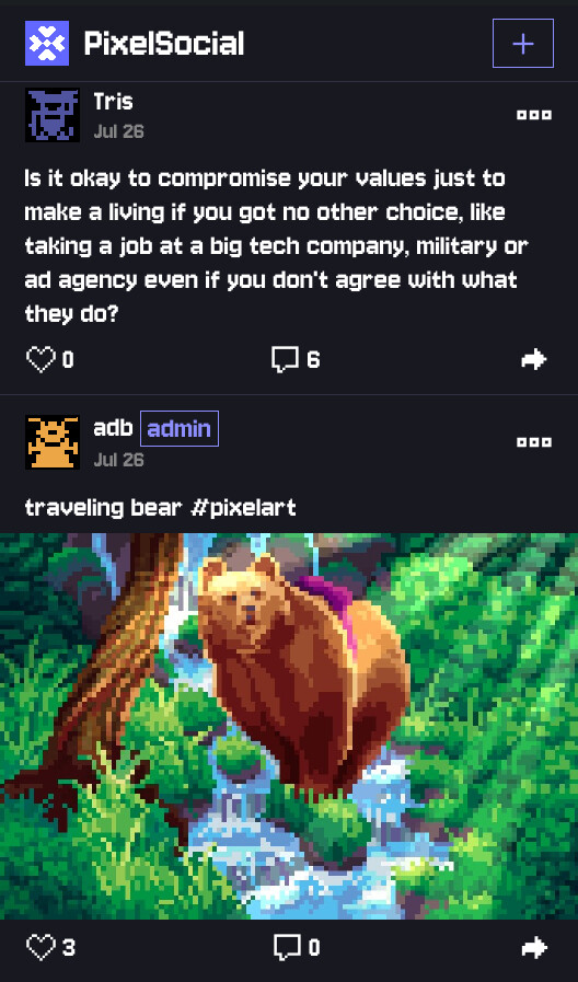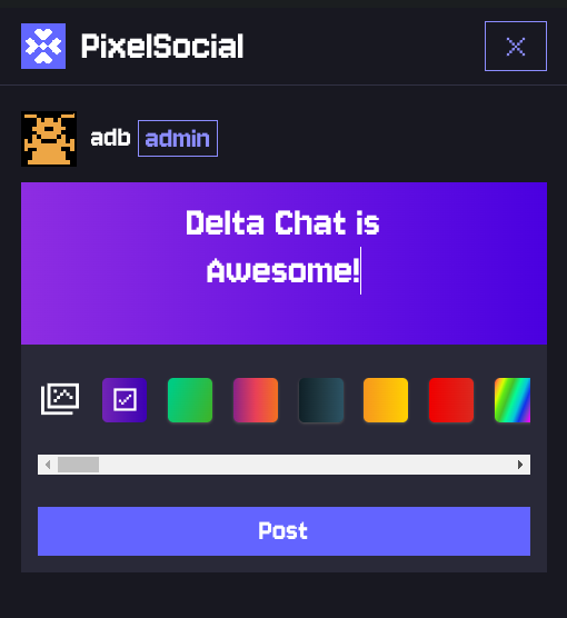 hi, you probably already noticed there is a PixelSocial webxdc app in the store, with it you can have your very own private e2ee social network with a group of family and friends, but there is also public instances via Delta Chat bot! you can peek at it without any login required, fully anonymous, there are two instances: