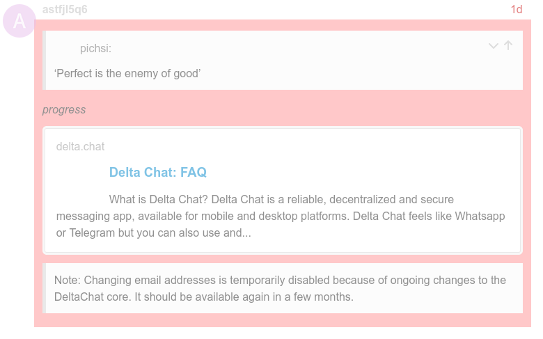 In this topic -->> The life-changing magic of WKD - #56 by Minim there was yesterday information that Delta Chat devs had removed the feature which was very important in terms of decentralisation and keeping contacts during changing the server.