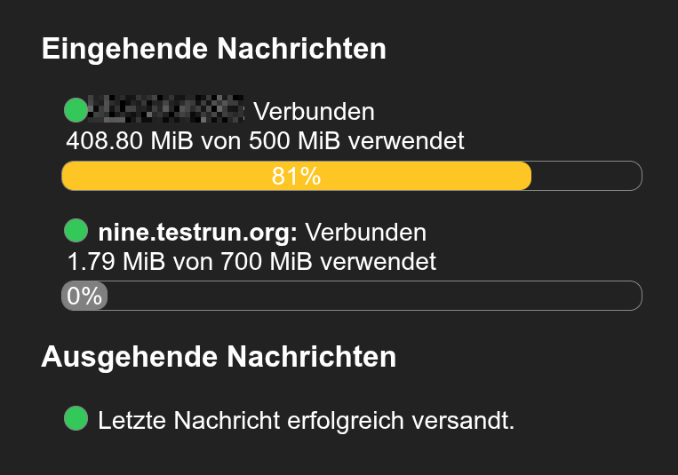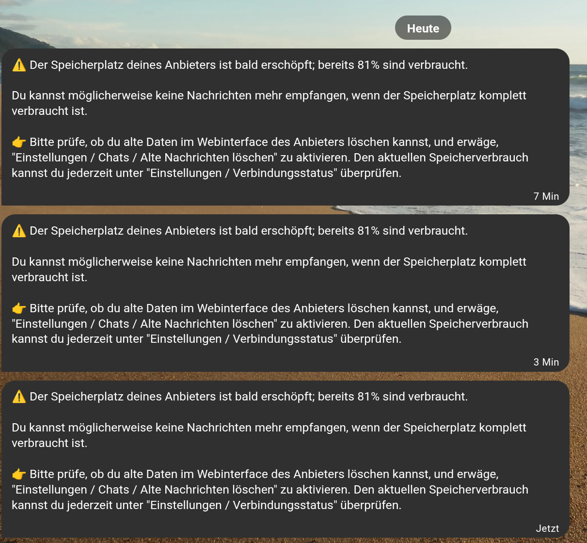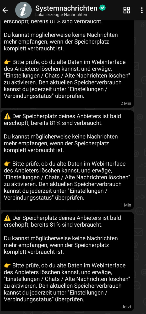 I manage my own Chatmail relay so I’m currently playing around with all the values to find what fits me and the potential users best. Currently I set the storage limit to 500MB on this relay and now I’m using around 81% of it: